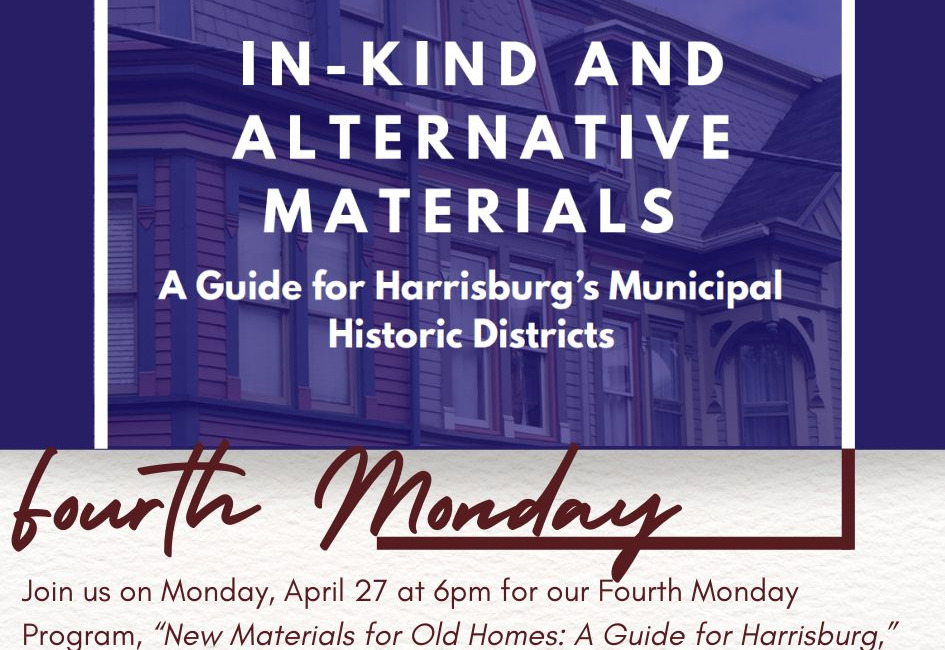 Presented by the Historic Preservation Specialist for the City of Harrisburg, Ericka Kauffman. This discussion will cover what materials are considered appropriate replacements in historic homes and provide an overview of the permitting process within these districts. 6PM. FREE and open to the public.