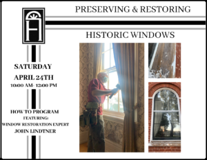 Nationally recognized window expert John Lindtner returns with a new hands-on how-to seminar featuring actual historic windows and video footage of his recent “house call” to examine 200-year-old windows of Haldeman-Haly House on Front Street’s Governors Row.