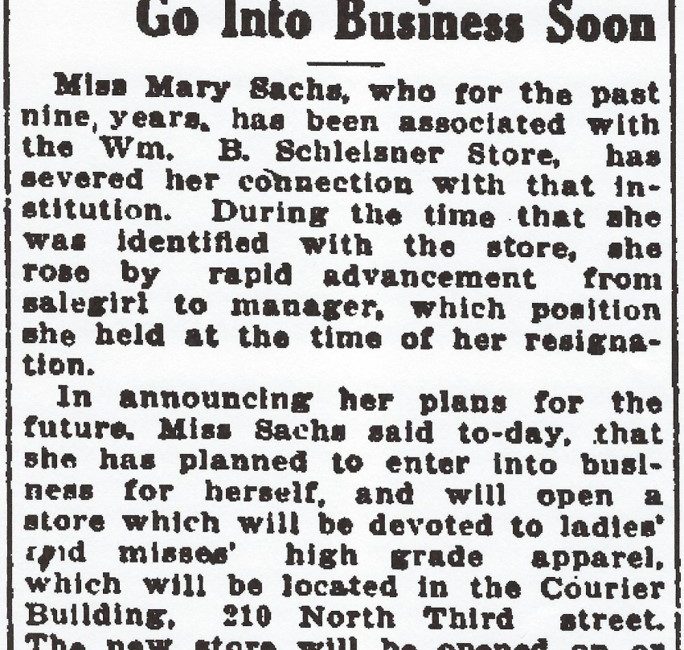 In 1918 Mary announced her departure from William B. Schleisner Store in order to go into business for herself by opening a women’s clothing store.